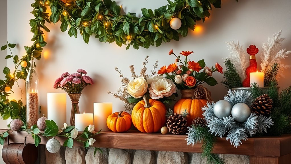 Seasonal decor offers endless opportunities to refresh your mantel. During spring, incorporate fresh flowers, pastel-colored candles, or botanical prints that evoke renewal and growth. Summer calls for bright, airy elements like seashells, driftwood, or nautical-themed accents. Fall lends itself to warm tones, pumpkins, and rustic wood pieces, while winter invites cozy touches like fairy lights, evergreen branches, and holiday ornaments. By blending vintage accents or minimalist styles with these seasonal elements, you keep your mantel dynamic and reflective of the time of year.