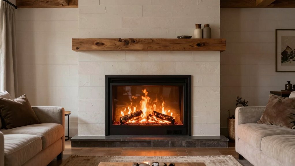 Think of farmhouse electric fireplaces as a gentle guardian, keeping your loved ones safe. They’re designed with child safety and pet protection in mind, featuring cool-to-touch surfaces and secure screens. While they’re generally safe, always supervise your kids and pets around any heating appliance. Proper placement, safety features, and regular maintenance guarantee your home remains warm, cozy, and secure for everyone.