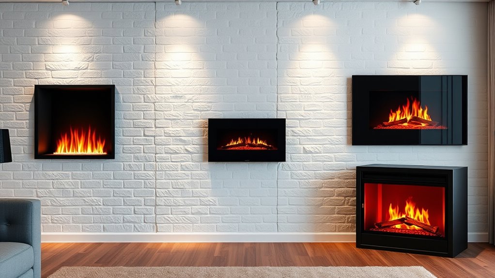 You can choose from various electric fireplace types to suit your space and style. Inserts fit into existing fireplaces or custom enclosures, mimicking traditional looks without venting. Wall-mounted units save floor space and are easy to install on your wall, offering modern aesthetics. Freestanding models are portable and simple to set up, providing flexibility. Each type features safety features like automatic shut-offs and cool exteriors. Keep exploring to discover which style best fits your needs and decor.