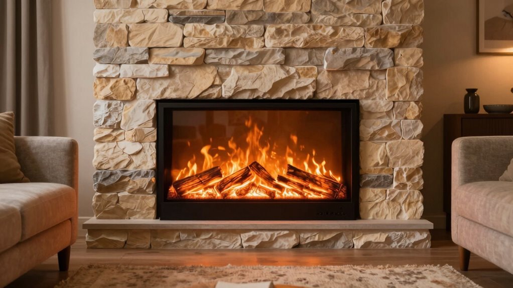 Electric fireplaces produce no emissions or pollutants, making them ideal for maintaining good indoor air quality. Their emission-free operation means you don’t have to worry about smoke, soot, or harmful gases filling your space. Unlike traditional fireplaces, electric models don’t burn fuel, so they won’t release combustion byproducts. This clean operation guarantees you enjoy cozy warmth without compromising your home’s air purity or your health.
