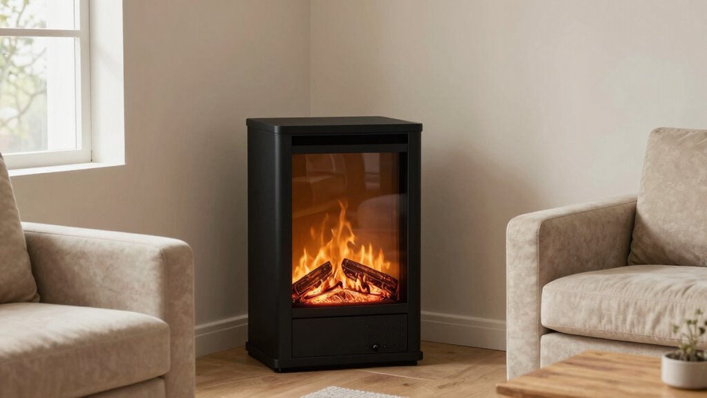 Electric fireplaces require minimal maintenance compared to traditional ones. You should regularly clean the glass and dust the unit to keep it looking good. Unlike wood-burning fireplaces, you don’t need chimney maintenance or vent cleaning, which simplifies upkeep. Just make certain the power cord stays undamaged, and occasionally check for any dust buildup inside the unit. This easy maintenance makes electric fireplaces a convenient choice for renters.