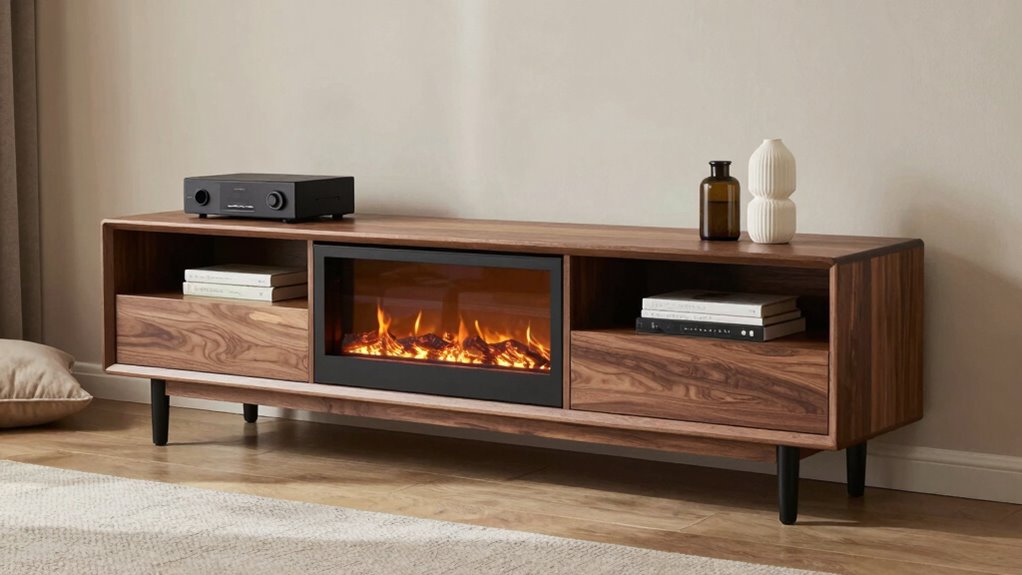 A fireplace TV stand can be a stylish and functional addition to your living space, but before making a purchase, it’s important to understand what features and considerations matter most. The first thing you should think about is safety considerations. When dealing with a unit that combines a TV stand and fireplace, safety isn’t something to overlook. You want a stand that’s designed with proper heat shielding, ensuring the heat from the fireplace doesn’t damage your electronics or pose a fire hazard. Check if the stand has built-in safety features like cool-touch glass or heat-resistant panels, especially if you have children or pets. It’s also wise to verify that the fireplace component has an automatic shut-off feature in case it overheats or malfunctions. Proper ventilation is essential, so look for stands that allow heat to dissipate effectively, preventing heat buildup that could compromise safety or damage your devices. Additionally, understanding home safety tips can help you create a safer environment when using these units. Material durability is another critical consideration. Since your fireplace TV stand will likely endure frequent use and regular cleaning, you need a sturdy, long-lasting material. Solid wood, metal, or high-quality engineered wood are popular options because they withstand daily wear and tear well. Avoid flimsy materials that could warp, crack, or deteriorate over time. If you’re investing in a stand with a mantel or shelving, ensure those elements are reinforced and securely attached. Pay attention to finishes as well; a durable coating can resist scratches, stains, and heat damage, maintaining the stand’s appearance for years. Since heat exposure is inevitable, choose a material that can tolerate temperature fluctuations without warping or compromising its structural integrity. Material selection plays a vital role in ensuring your stand remains safe and attractive over time. Incorporating Proper ventilation features during design can greatly enhance safety and efficiency. For added peace of mind, some stands include protective features such as heat-resistant glass or panels that help contain heat and prevent accidental contact. Moreover, considering the contrast ratio of the fireplace insert can influence the visual warmth and ambiance it produces, affecting the overall atmosphere of your home. In addition to safety and durability, consider how well the stand fits your space and decor style. Measure your area carefully to ensure it’s proportionate and leaves enough room for movement. Think about your existing furniture and whether the stand’s design complements your decor. Many stands feature a modern, rustic, or traditional look, so selecting one that matches your style can elevate the overall aesthetic of your living room. Finally, look into the assembly process and warranty. A stand that’s easy to put together saves you time and frustration, especially if you’re not handy with tools. A good warranty offers peace of mind, protecting your investment against defects or damage. By paying attention to safety considerations, material durability, and practical aspects like size and style, you’ll be better equipped to choose a fireplace TV stand that’s both safe and built to last.