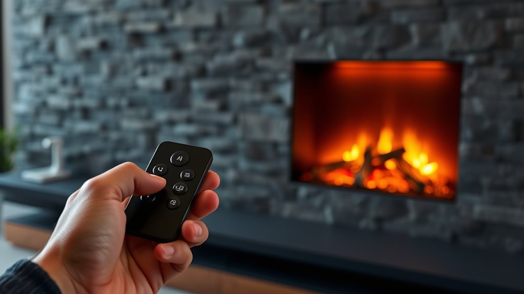 A typical remote battery lasts about 6 to 12 months before needing replacement, depending on usage and the battery type. You should consider the battery lifespan and replacement frequency to guarantee your remote functions properly. If you notice reduced range or difficulty in controlling your fireplace, it’s time to replace the batteries. Regularly checking and changing them helps maintain seamless operation and prevents unexpected power loss.