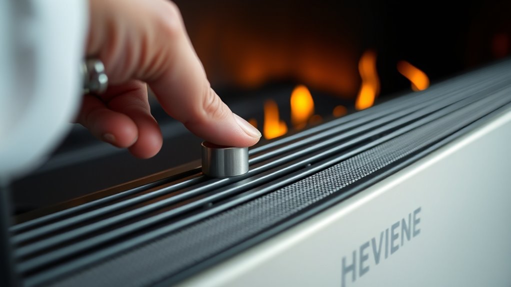 To quiet your electric fireplace fan, start by turning it off and unplugging it. Clean the fan blades gently to remove dust and debris that cause imbalance and noise. Check and lubricate the motor with a small amount of light oil if needed, following the manufacturer’s guidelines. Make certain the fan is mounted securely and inspect for worn or damaged parts to prevent vibrations. Proper maintenance can substantially reduce noise—keep exploring for detailed tips to keep your fan running smoothly.