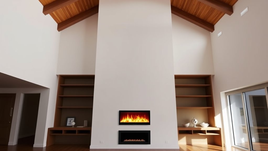 When it comes to heating your home efficiently, ceiling height plays a critical role. Higher ceilings can create a spacious, airy feel, but they also influence how well your electric fireplace performs. One key aspect to contemplate is ventilation considerations. With taller ceilings, heat disperses more quickly and tends to rise, making it harder to maintain consistent warmth at lower levels. You might find that your electric fireplace needs to work harder or be placed strategically to compensate for the increased volume of space. Proper ventilation becomes essential to guarantee that warm air circulates effectively, preventing cold spots and ensuring the heat is evenly distributed throughout the room. You may also want to explore additional heating accessories or fans to improve airflow, especially in rooms with very high ceilings. Additionally, selecting a suitable wattage electric fireplace is crucial to ensure adequate heating capacity for larger spaces. Aesthetic integration is another important factor. Taller ceilings often mean larger, more prominent fireplaces or feature walls to create a balanced look. You want your electric fireplace to blend seamlessly with your room’s design without feeling out of place or overwhelming the space. Consider how the fireplace’s size, style, and placement will align with your ceiling height and overall aesthetic. An overly large or poorly integrated fireplace can disrupt the visual harmony of a room, especially when ceilings soar high above. Conversely, choosing a sleek, minimalist electric fireplace can enhance the room’s aesthetic without dominating it. You might also opt for wall-mounted units or models that have a modern appearance, which tend to integrate well into high-ceilinged spaces. In rooms with high ceilings, you should also think about how the fireplace’s heat output matches the room’s volume. Electric fireplaces vary in their wattage and heating capacity, so selecting one suited to your space is essential. If the fireplace isn’t powerful enough, the temperature may struggle to rise to a comfortable level, making the room feel colder despite the presence of the heater. Conversely, an oversized unit could lead to overheating or energy inefficiency. Proper placement, combined with an understanding of ventilation considerations and aesthetic integration, helps optimize performance. It’s about balancing function and form—ensuring your electric fireplace heats effectively while complementing your room’s design. Ultimately, managing heating in spaces with high ceilings requires thoughtful planning. You need to address ventilation considerations to promote even heat distribution and choose an electric fireplace that aesthetically fits your room. When you pay attention to these details, your home stays cozy, stylish, and energy-efficient, regardless of ceiling height.