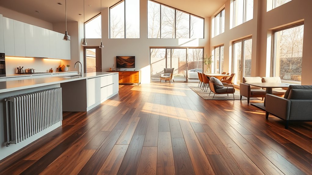 Your floor plan layout impacts heating efficiency because open-concept spaces promote even heat distribution, while partitioned rooms can create cold spots and require more targeted heating. Smaller rooms heat quickly but lose warmth faster without proper insulation, and exterior-facing areas tend to lose more heat. A well-designed layout minimizes heat loss and balances room sizes, making your heating system run more smoothly. Keep exploring to discover how smart design choices can boost your comfort and energy savings.