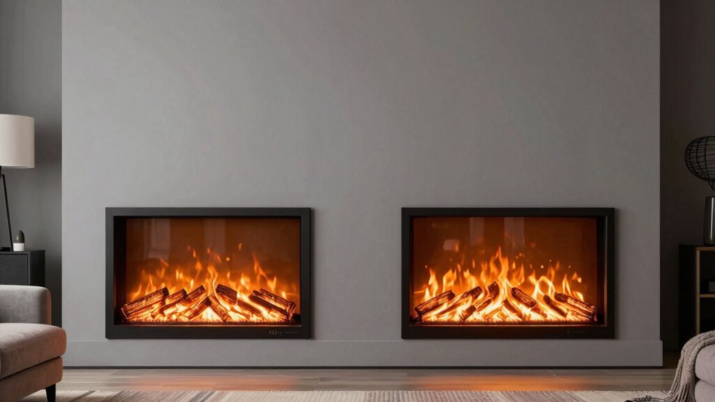 A 60-inch electric fireplace is generally more energy-efficient than a 72-inch one because it consumes less power while providing ample heat for smaller spaces. If your room is medium-sized, you’ll save on energy consumption and boost power efficiency with a 60-inch model. Larger fireplaces use more energy, which can increase your electricity bill. Choose the size that matches your space to optimize both comfort and energy efficiency.