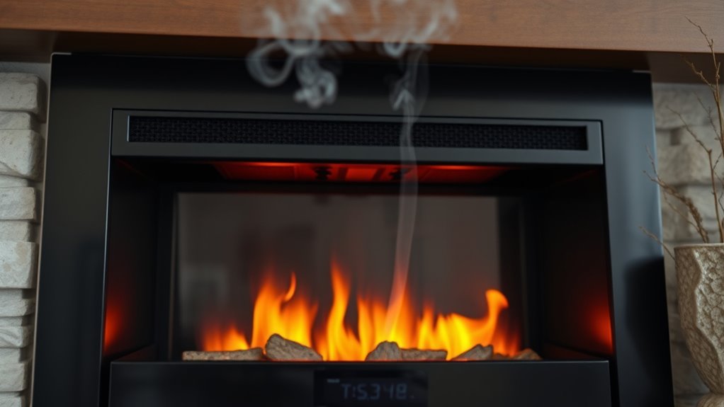 If you smell burning from your electric fireplace, don’t ignore it—think of it like a warning sign flashing bright. Turn off the unit immediately and unplug it to prevent further damage or fire risks. Check for any visible signs of damage or debris, and if you’re unsure, call a professional. Acting quickly is like catching a small spark before it becomes a blaze—your safety is worth every second.