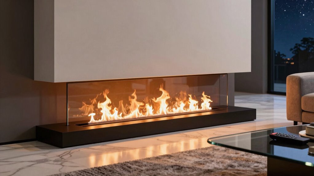 Decorative features can particularly elevate the visual appeal of a 60-inch linear fireplace, transforming it into a focal point in your space. Faux logs, crystal stones, and customizable ember beds add depth and texture, making the fireplace more realistic and inviting. Many models offer multiple flame colors and adjustable brightness, allowing you to tailor the ambiance to your mood or decor style. Some fireplaces even include sound effects like crackling, enhancing the cozy, authentic fire experience. Integrated lighting effects, such as LED flame beds with multiple color options, boost aesthetic versatility. Additionally, you can often personalize decorative elements—like swapping out crystal stones or driftwood—to match your interior design theme, ensuring your fireplace complements your overall decor perfectly.