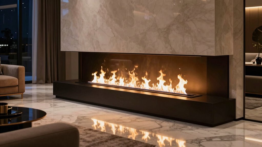 The heating capacity of an 88-inch linear fireplace directly influences its ability to warm your space effectively. Typically, these fireplaces offer between 750W and 1500W, making them suitable for areas up to around 400 square feet. Higher wattage models, around 1500W, provide more substantial heat, ideal for larger or open-concept rooms. Some units feature dual heating modes, allowing you to switch between low and high settings for tailored comfort and energy efficiency. Infrared quartz technology is also present in certain models, delivering quick, skin-friendly heat that mimics natural sunlight. It’s important to match the fireplace’s capacity with your room size to guarantee consistent warmth without wasting energy. Proper alignment ensures comfort and maximum efficiency in your luxury interior.