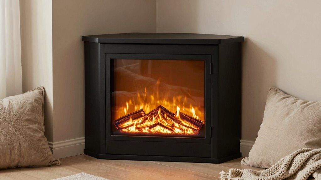 Corner electric fireplaces are generally more energy-efficient than traditional fireplaces because they convert electricity directly into heat with minimal loss. Unlike wood or gas fireplaces, they don’t waste energy through venting or heat escape. I find they’re an excellent choice for efficient heating, especially since you can control the temperature precisely. Plus, they don’t produce emissions, making them a greener, cost-effective option for cozying up your space.