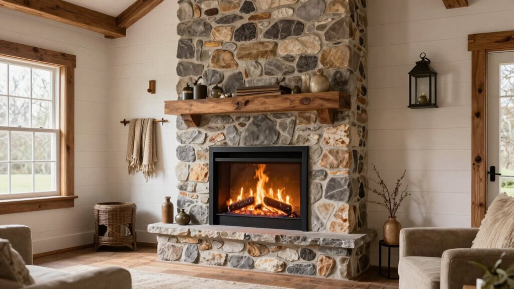 Choosing an electric fireplace for farmhouse decor means paying close attention to flame realism and colors, as these features considerably influence the overall ambiance. Realistic flames often feature three-dimensional effects that flicker and dance, mimicking the natural movement of a real fire. Many models offer a range of colors, from classic orange and yellow to modern shades like blue, purple, or multi-color options, allowing for customization. Dynamic flame modes with varying movement and brightness can enhance authenticity, creating a cozy, inviting atmosphere. The ability to adjust flame color and brightness separately helps tailor the fire to match specific farmhouse themes. Complemented by glowing ember beds and logs, these features create a depth and authenticity that truly elevates the fire’s visual appeal.