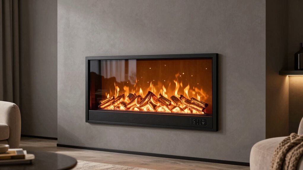 Selecting an electric fireplace with the right heating capacity is essential to guarantee your wall project heats your space effectively without wasting energy. Most models range from 750W to 1500W, with higher wattages producing more heat and higher BTU outputs. This allows for adjustable warmth levels to suit your needs. Typically, electric fireplaces are effective for rooms up to 400 square feet, but matching the wattage to your room size is important. Dual-mode heaters offer the flexibility of 750W and 1500W settings, providing energy-efficient operation while ensuring sufficient heat for medium-sized spaces. Choosing a fireplace with an appropriate heating capacity helps avoid energy waste and keeps your space comfortably warm, making it a key factor in selecting the best unit for your wall project.