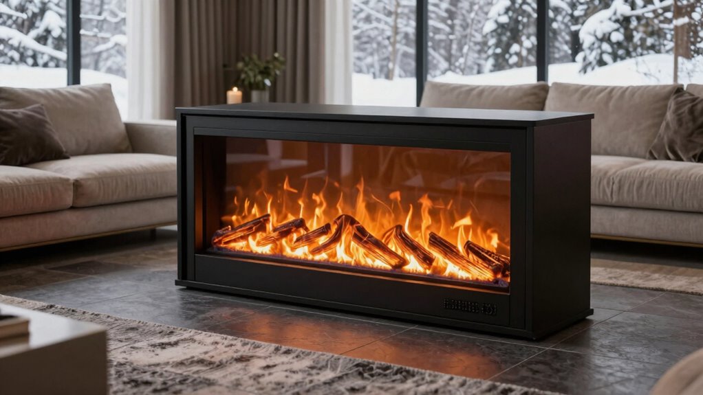 Selecting an electric fireplace that harmonizes with your living room’s decor involves paying close attention to its design, style, and finish. I recommend choosing a unit that complements your existing color scheme and furniture. Consider the fireplace’s size and shape to guarantee it fits proportionally within your space. For a modern look, sleek black glass or minimalist designs work well, while rustic wood finishes suit farmhouse decor. The finish and material should enhance your overall aesthetic, whether it’s polished, matte, or textured. Also, check the visual effects, like flame colors and media bed styles, to match your desired ambiance. The goal is to find a fireplace that seamlessly blends into your room, elevating your space without feeling out of place.