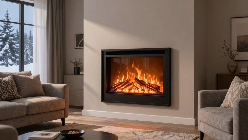 Matching your electric fireplace to your manufactured home’s interior style is key to creating a cohesive look. I always consider the existing decor’s color scheme and design to guarantee the fireplace complements it. For instance, a modern home pairs well with sleek, minimalist units, while rustic interiors look great with fireplaces featuring natural finishes. I also look for customizable flame effects and lighting options to match different moods and preferences. Proportional harmony matters, so I choose a size and shape that fit well within the room’s dimensions and furnishings. If space is limited, I opt for a unit with a slim, unobtrusive profile to keep the room feeling open and uncluttered. Ultimately, aesthetic compatibility enhances both the beauty and harmony of the space.