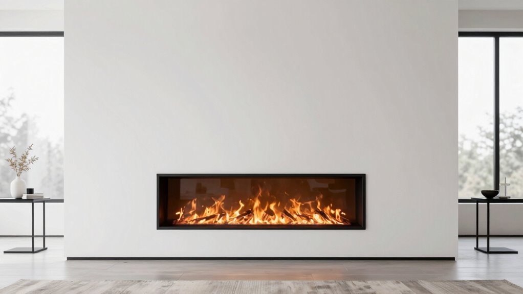Choosing an electric fireplace that fits a minimalist room isn’t just about style; it also needs to effectively heat the space. To do that, check its heating capacity, usually measured in BTUs, to guarantee it matches your room size. Most models cover between 400 to 1000 square feet, so pick one that aligns with your space. An adjustable thermostat is essential for precise temperature control, helping you stay comfortable without wasting energy. Power wattage, typically between 750W and 1500W, influences both heating output and efficiency—higher wattage generally means warmer heat. Also, safety features like overheat protection and automatic shut-off are critical. They give you peace of mind, making sure your minimalist haven remains cozy and safe.