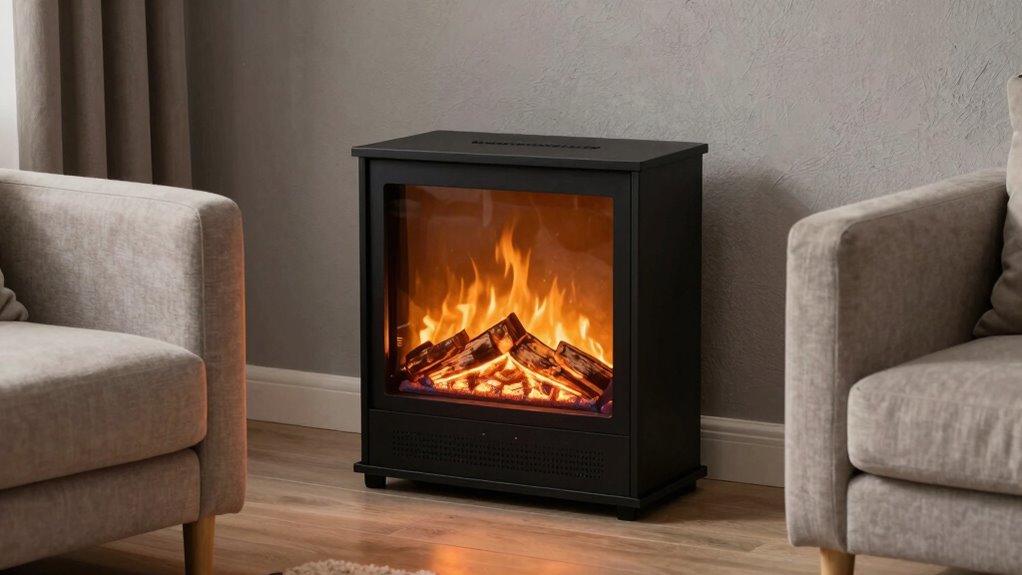 Budget considerations play a crucial role when selecting an electric fireplace for a small space, as prices can vary widely. You can find options under $100 or invest over $500 for premium features. It’s important to take into account the total cost, including installation and maintenance, to make sure it fits your budget. Cheaper models might lack features like adjustable flame colors or remote controls, which could impact your long-term satisfaction. On the other hand, spending a bit more on an energy-efficient unit can save money on electricity bills over time. When comparing options, look at features and warranties relative to price to get the best value. Balancing cost with functionality ensures you choose a fireplace that meets your needs without overspending.