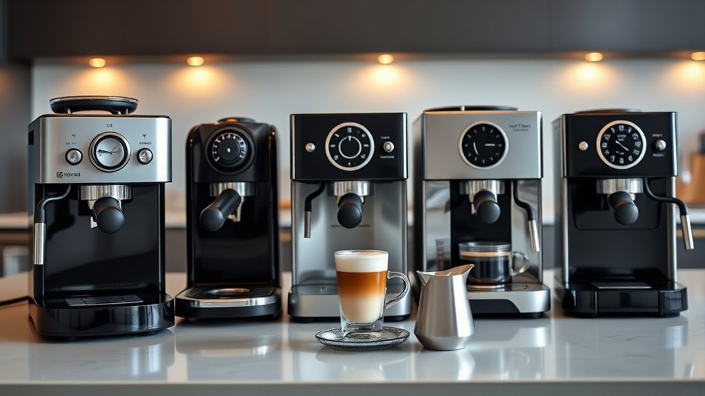 Choosing an espresso machine that’s easy to operate can make all the difference for beginners. Look for models with intuitive controls, like push buttons or touchscreens, so you don’t have to wrestle with complicated settings. Features like automatic milk frothing and pre-programmed drink options help you make consistent beverages without extensive skill or effort. Clear indicators, such as pressure gauges and LED lights, are invaluable for monitoring and adjusting brewing parameters easily. Additionally, machines with simple maintenance—removable water tanks and drip trays—save you time and reduce frustration. A compact, user-friendly design minimizes setup and makes the brewing process accessible for those just starting out. Overall, ease of operation boosts confidence and guarantees a smoother, more enjoyable espresso experience.