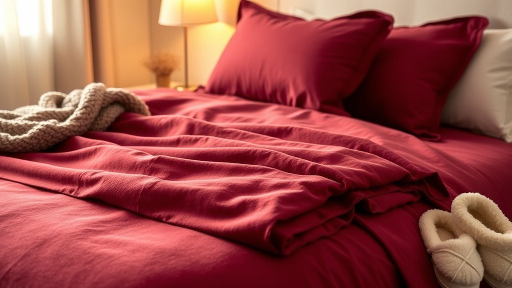 Think of flannel sheets like a beloved cozy sweater—care keeps them soft and inviting. I wash mine in cold water on a gentle cycle and avoid fabric softeners, which can dull the fabric. Tumble dry on low or air dry to prevent pilling. Regular gentle care preserves their softness and keeps them feeling just as comfy as day one, making every night’s sleep feel extra special.
