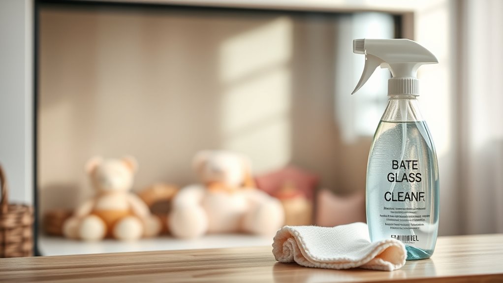 Yes, I always choose glass cleaners that are labeled child-safe and non-toxic for nurseries. I make sure to keep kids away during cleaning and wait until surfaces are completely dry before allowing children near. I trust brands that use natural ingredients, as they’re safer for little ones. It’s important to read labels carefully and follow all safety instructions to guarantee both effectiveness and safety for children.