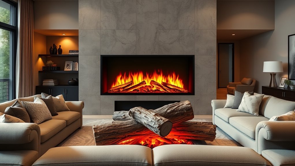 Yes, many electric log sets offer customizable options for flame colors and sounds, which I find really enhances the cozy atmosphere. You can usually adjust the flame’s hue, brightness, and even add crackling or roaring sound effects to mimic real fires. I love experimenting with these features to create a perfect ambiance, whether I want a warm glow or a lively crackling fire. It’s a great way to personalize my space and enjoy a realistic fireplace experience.