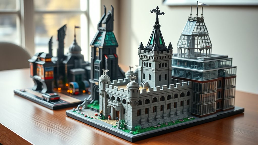 Selecting the right LEGO set for display involves carefully considering its size and how well it fits into your designated space. Measure your available area to ensure the set won’t overwhelm or get lost in the surroundings. Think about the complexity of the build and whether it matches your skill level, as larger or more intricate models may need extra space for assembly and display. Consider the visual impact—choose designs that enhance your room’s décor or collection theme. Stability is also key; larger sets should be secure and unlikely to topple. If the set comes with a stand or base, it can elevate the display and protect your investment from accidental damage. Ultimately, choosing a set that complements your space guarantees it becomes a proud, long-lasting display piece.