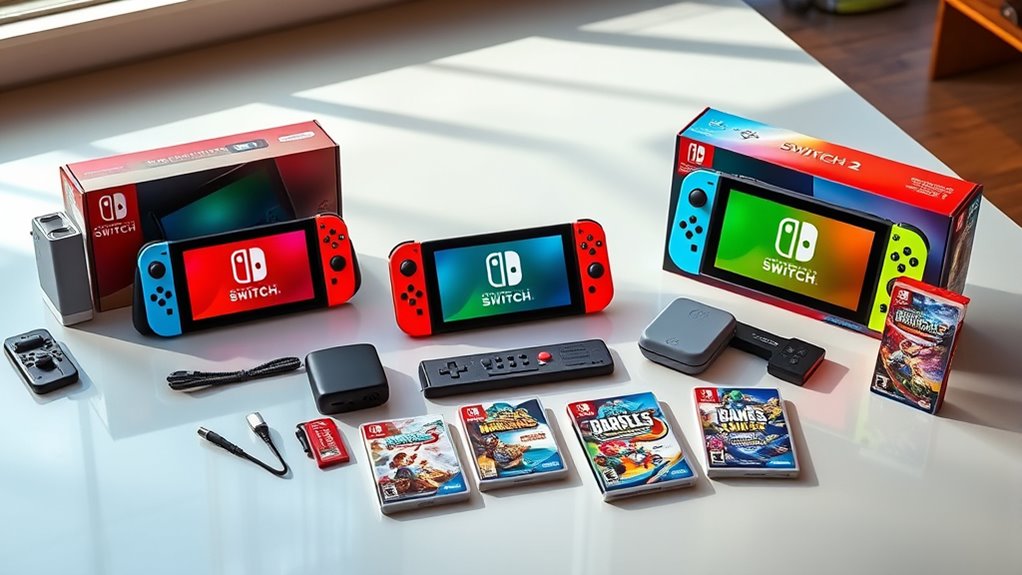 Including the right accessories in a Nintendo Switch 2 bundle can substantially enhance your gaming experience and device longevity. Extra Joy-Con controllers allow for seamless multiplayer sessions, while charging docks keep everything powered and ready to go. Screen protectors help prevent scratches, preserving the display’s clarity over time. Some bundles include microSD cards, like 128GB, so you can store more games and content without worry. Many packages also feature a game—either physical or digital—adding immediate value and entertainment options. Online memberships, such as Nintendo Switch Online, are often included or offered as bonuses, enabling multiplayer and access to classic titles. Peripheral accessories like carrying cases and grips improve portability and comfort, making gaming on the go more enjoyable. These extras can make a significant difference in your overall experience.