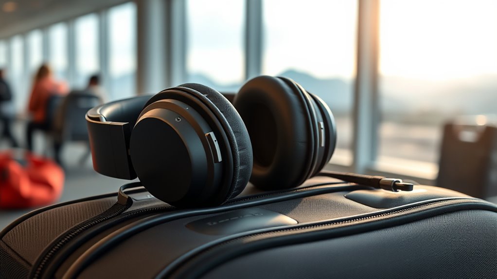Ever wondered how comfortable your headphones will feel during long travels? Comfort and fit are essential for enjoying your journey without distraction. Look for headphones with adjustable headbands and rotating ear cups—this customization helps create a secure, personalized fit. Lightweight designs, ideally under 0.55 pounds, prevent fatigue and make extended wear easier. Soft, plush ear cushions made from breathable materials like protein leather or memory foam enhance comfort and reduce pressure on your ears. Some models offer foldable or collapsible structures, making packing simpler and more convenient. Most importantly, guarantee the headphones distribute pressure evenly around your ears to avoid soreness during long hours. Prioritizing fit and comfort ensures you’ll enjoy your noise-canceling headphones on every trip without discomfort.