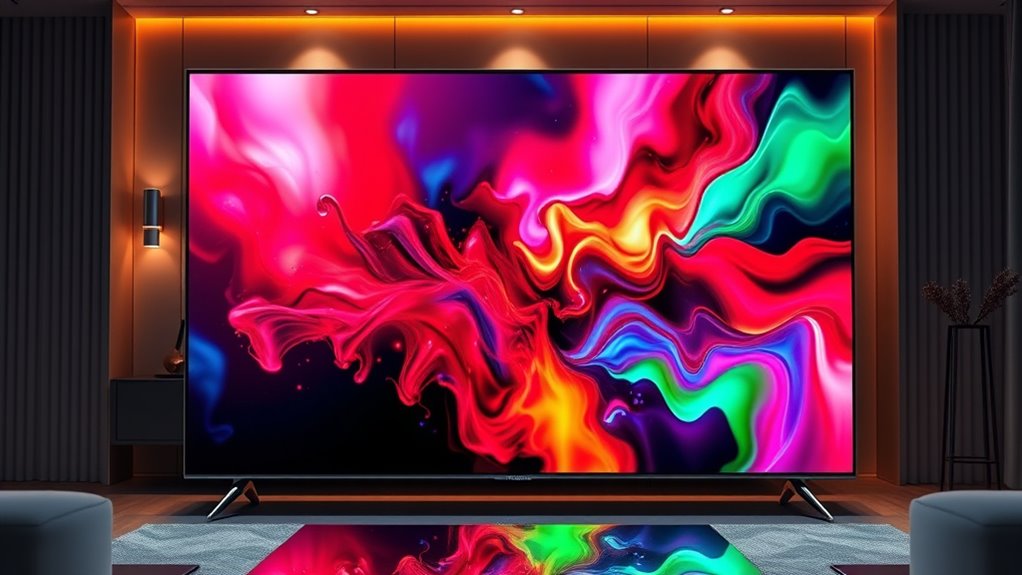 Think of OLED TVs as energy-efficient artists, using just enough light to create vivid images without wasting power. During extended use, they consume less energy than traditional LED screens because each pixel lights up independently. I’ve found they balance stunning visuals with lower energy bills, making them a smart choice for long movie nights or gaming marathons. This efficiency helps keep your electricity costs down while delivering brilliant, immersive viewing experiences.