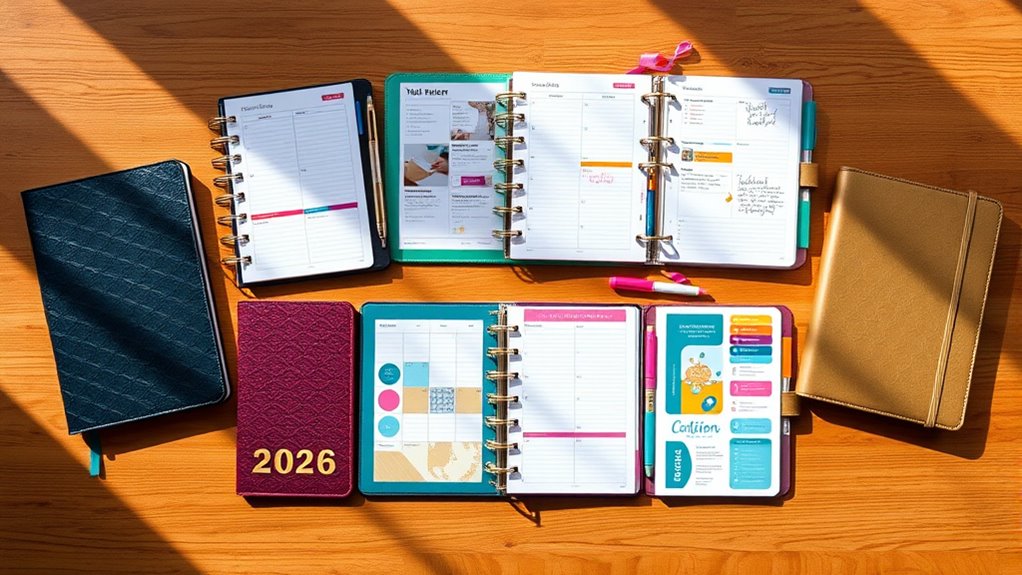 If you’re looking to stay organized in 2026, I recommend checking out the top five planners that combine durability, style, and functionality. From hardcover options with tabs and inner pockets to weekly planners with hourly slots, these choices help you manage every aspect of your schedule. Whether you prefer compact A5 sizes or larger formats, there’s something to match your needs. Keep exploring to find the perfect planner to keep you ahead all year long.
