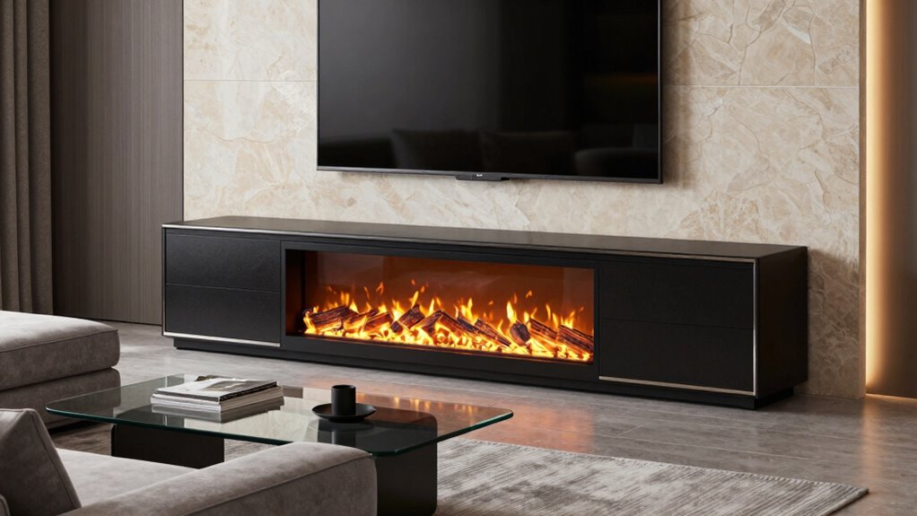 These consoles are generally not suitable for outdoor installation. I recommend keeping them indoors because exposure to moisture, temperature fluctuations, and weather elements can damage the electrical components and reduce their lifespan. If you’re looking for outdoor options, I suggest specialized outdoor electric fireplaces designed to withstand the elements. Always check the manufacturer’s guidelines to guarantee you’re choosing a safe and durable option for your outdoor space.