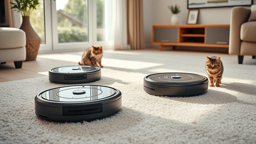 Robot vacuums are generally safe for homes with multiple pets, but I recommend choosing models with strong suction and tangle-free brushes to handle pet hair efficiently. I always guarantee their sensors are clean to prevent collisions, and I keep pet toys and cords out of the way. Regular maintenance like emptying the bin and checking brushes keeps my vacuum running smoothly and my home spotless.