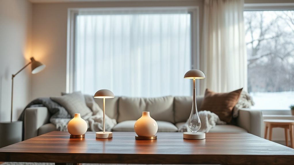 Ensuring safety and ideal light quality is vital when choosing a sad lamp for winter blues. I always look for lamps that emit UV-free light to prevent skin and eye damage, especially during prolonged use. It’s important that the lamp provides a consistent 10,000 Lux brightness, effectively mimicking natural sunlight to boost mood. Flicker-free and glare-free lighting help reduce eye strain and discomfort, making therapy sessions more comfortable. Adjustable brightness and color temperature settings allow me to customize the experience for maximum safety and comfort. In the end, I prefer high-quality, full-spectrum lights that deliver therapeutic benefits without harmful UV exposure. Prioritizing these factors guarantees my light therapy is both safe and effective, giving me peace of mind during darker months.