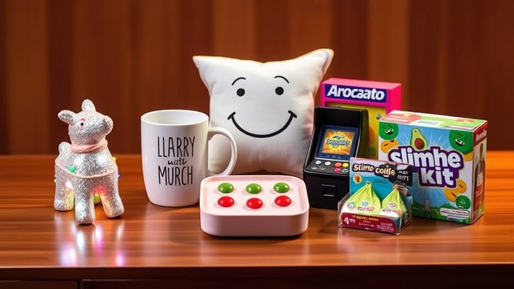 Understanding a recipient’s sense of humor is crucial when selecting a white elephant gift under $50, as it guarantees the gift will genuinely amuse and engage them. Knowing whether they prefer silly, sarcastic, or clever jokes helps narrow down the perfect choice. Some people love gifts that are outright ridiculous or absurd, while others appreciate witty puns or subtle humor. Recognizing if they enjoy gag gifts, novelty items, or more refined comedy guides you toward an appropriate and appreciated present. It’s also helpful to contemplate if they favor lighthearted fun or darker, edgier humor, as this influences what will truly make them laugh. Finally, understanding how they react to humor—whether they love surprises, enjoy embarrassing moments, or prefer to be amused—ensures your gift hits the right note.