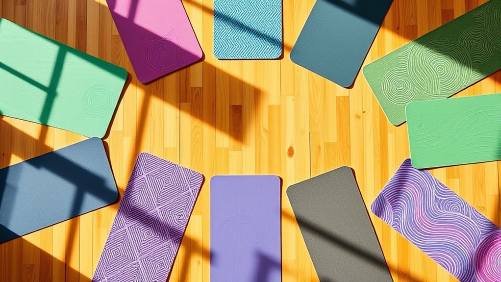 Choosing a yoga mat with a high-quality non-slip surface is essential for maintaining stability during your practice. A good surface features textured patterns or wavy designs that increase grip, especially when you sweat or hold poses for extended periods. The material, like TPE or PVC, plays a pivotal role in traction and slip resistance, so opt for options known for durability and grip. Double-sided non-slip surfaces offer added stability, preventing shifting in different directions. The texture should resist wear over time, ensuring consistent grip even with frequent use. Proper grip not only enhances safety but also boosts confidence, allowing you to focus fully on your poses without fear of slipping or injury. Prioritizing surface quality is key to a safer, more comfortable practice.